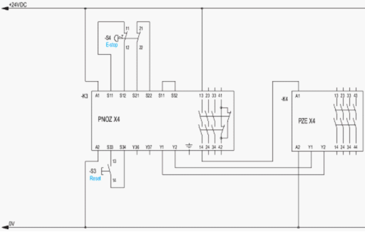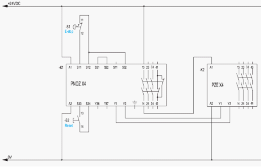 若是使用單通道信號輸入,進(jìn)入安全繼電器,那么這個控制電路的安全等級是在2級,如圖4所示。