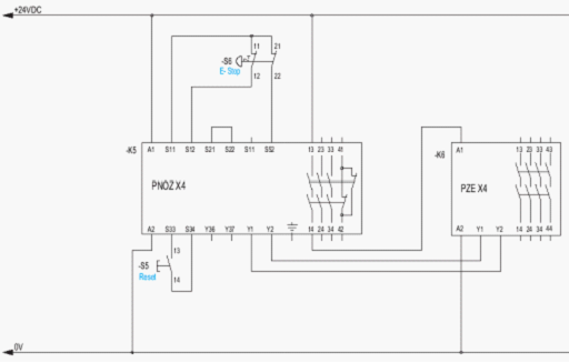 若使用雙通道信號輸入,進(jìn)入安全繼電器,同時可檢測兩個輸入觸點(diǎn)間的短路。那么這個控制回路的安全等級是在4級,如圖6所示。