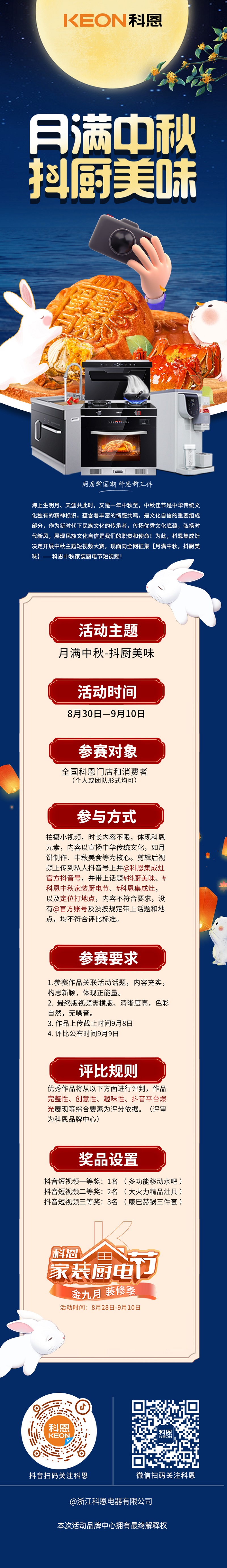 海上生明月、天涯共此時,又是一年中秋至,中秋佳節(jié)是中華傳統(tǒng)文化獨有的精神標識,蘊含著豐富的情感共鳴,是文化自信的重要組成部分,作為新時代下民族文化的傳承者,傳揚優(yōu)秀文化底蘊,弘揚時代新風,展現(xiàn)民族文化自信是我們的職責和使命!為此,科恩集成灶決定開展中秋美食節(jié)短視頻大賽,現(xiàn)面向全網(wǎng)征集【月滿中秋,抖廚美味】——科恩中秋家裝廚電節(jié)短視頻!