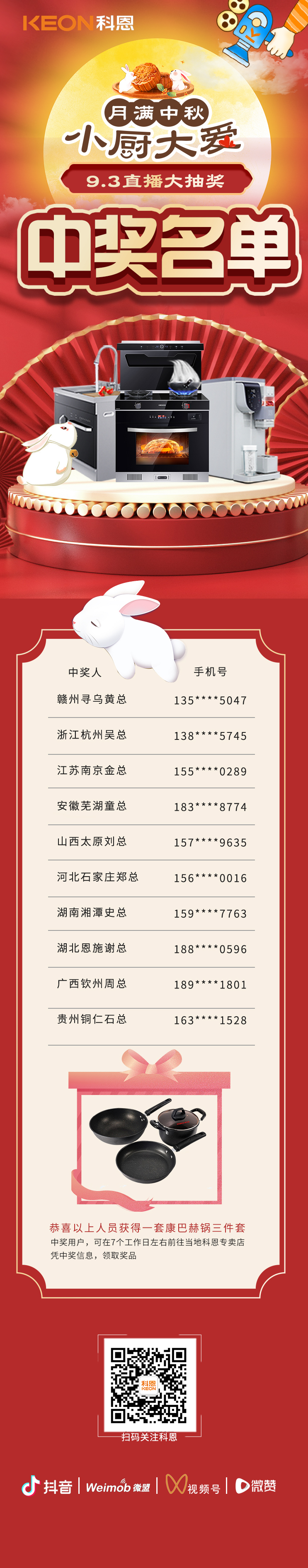 話不多說,先來公布9月3日晚第二期月餅DIY直播現場中獎名單,恭喜以下10位幸運寶寶!請在七個工作日左右,憑中獎信息到當地科恩專賣店領取您的專屬獎品!沒有中獎的寶寶也不用氣餒,沒準下一期的直播大獎就在向你招手!你就是幸運錦鯉本鯉!