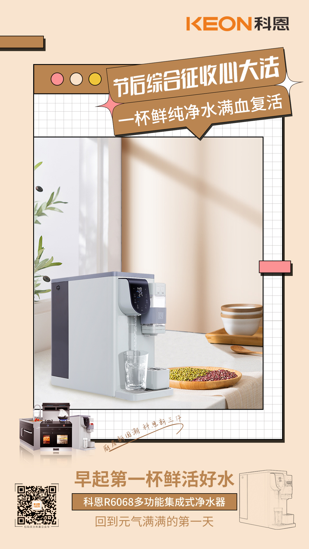 國(guó)慶長(zhǎng)假,熬夜晚起定時(shí)常態(tài),你需要一杯鮮活好水,煥新身體細(xì)胞,回到元?dú)鉂M滿的第一天!科恩R6068多功能集成式凈水器,一鍵適配不同飲水需求,溫度水量皆可調(diào)控,百變泡飲,滴滴鮮醇,RO精濾,UV殺菌,精濾至微,暢飲無(wú)憂,健康隨行!