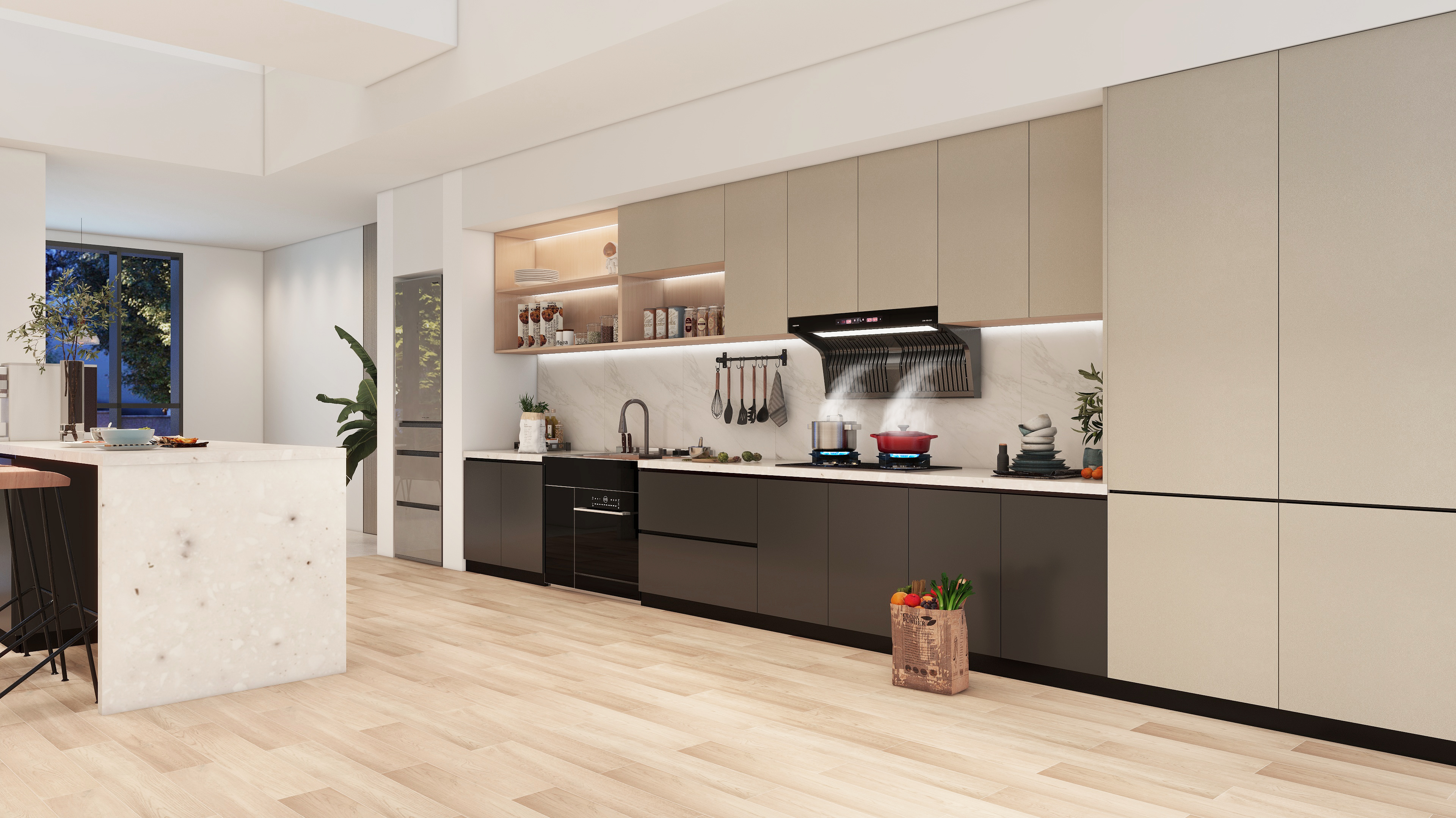 年輕一代都偏愛(ài),半開(kāi)放式及開(kāi)放式廚房。一是考慮到美觀度,還有一個(gè)就是陪伴!相對(duì)于老一代悶聲在廚房烹飪,年輕一代更喜歡在烹飪的時(shí)候與家人、朋友一起聊聊天。在這種新生的趨勢(shì)中,人們對(duì)廚房的期待,已經(jīng)不僅是為了“忙活出一頓飯”。