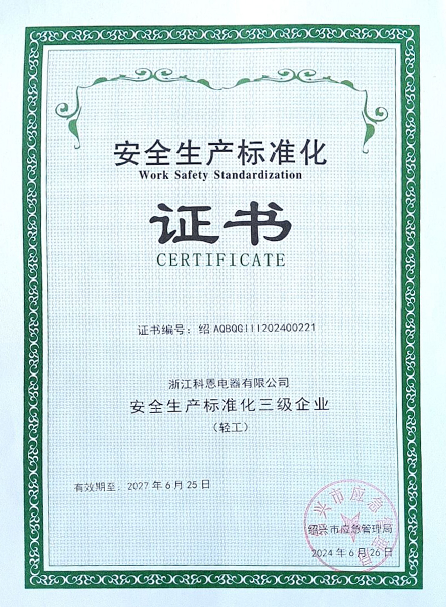 浙江科恩電器有限公司榮獲“安全生產(chǎn)標(biāo)準(zhǔn)化三級企業(yè)”榮譽(yù),展現(xiàn)創(chuàng)新企業(yè)安全理念!