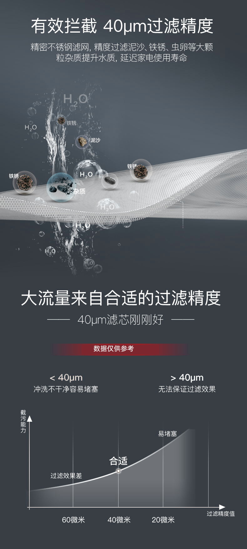 同時,Q30采用40um過濾精度,精密不銹鋼濾網(wǎng),精度過濾泥沙、鐵銹、蟲卵等大顆粒雜質(zhì),提升水質(zhì),延長家電使用壽命,完美解決新小區(qū)洗衣機進砂石的煩惱。