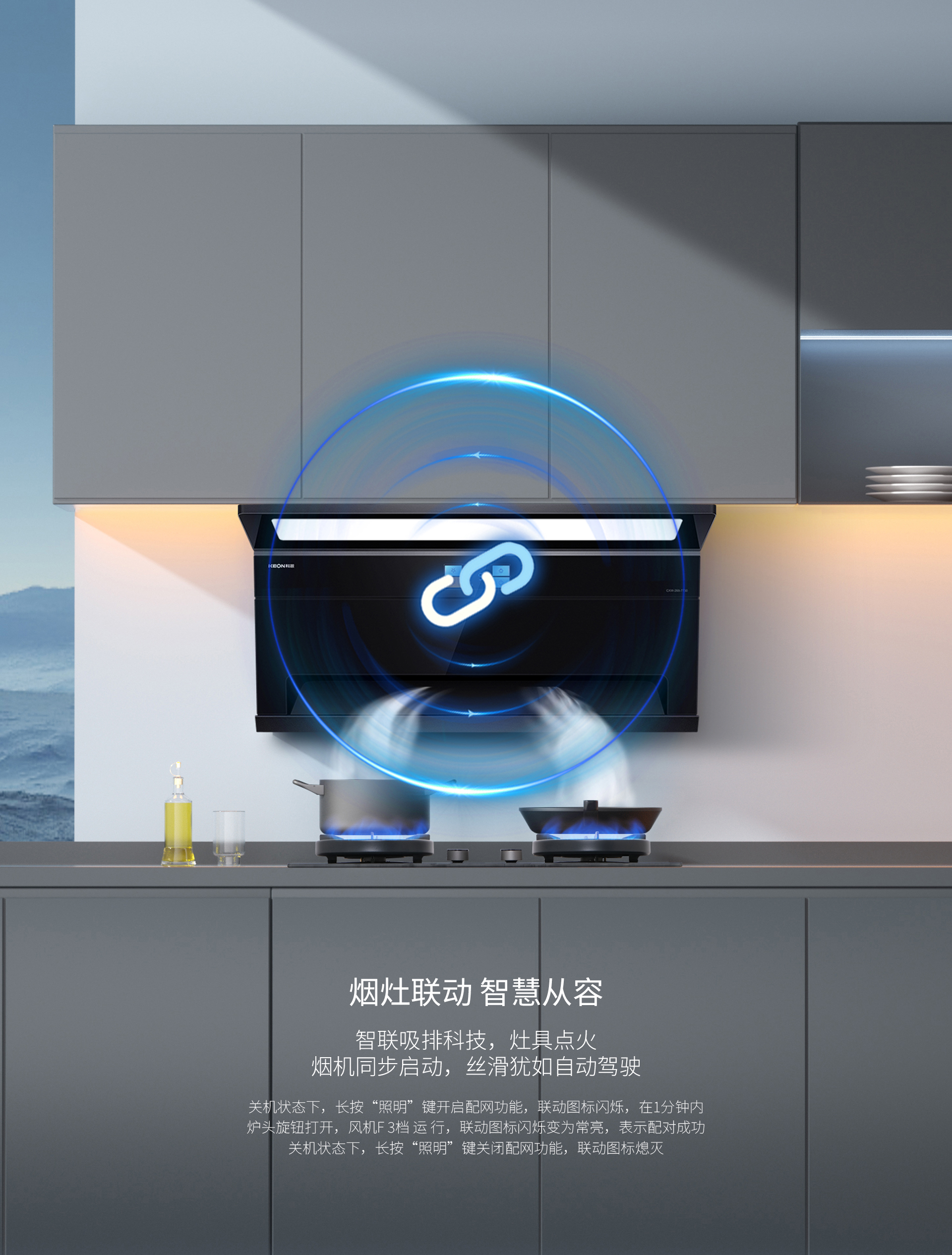 煙灶聯動的智聯吸排科技更是展現出了其智慧從容的一面。當灶具點火的瞬間,煙機便同步啟動,整個過程絲滑順暢,猶如自動駕駛般智能。這種緊密的聯動配合,有效確保了在烹飪過程中產生的油煙能夠及時被吸排,讓廚房空氣時刻保持清新。