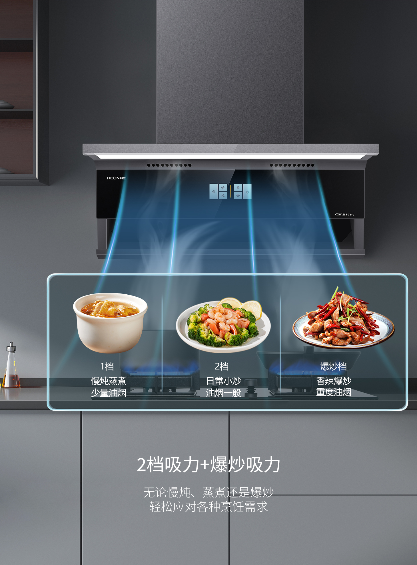 科恩旗艦款大吸力油煙機7810,兩檔吸力+爆炒模式,輕松下廚零負擔。智能自清洗去除頑固油污,延時凈煙自動清除余味,守護廚房每一寸清新。攜手科恩,煥新生活。科恩7810凈煙有魄力廚房方寸皆自由。這個舊廚煥新季,換一臺會思考的煙機給廚房一次溫柔革命