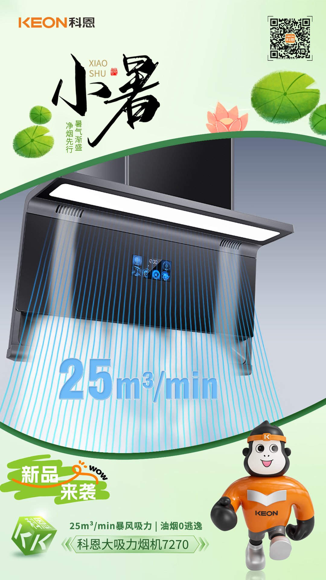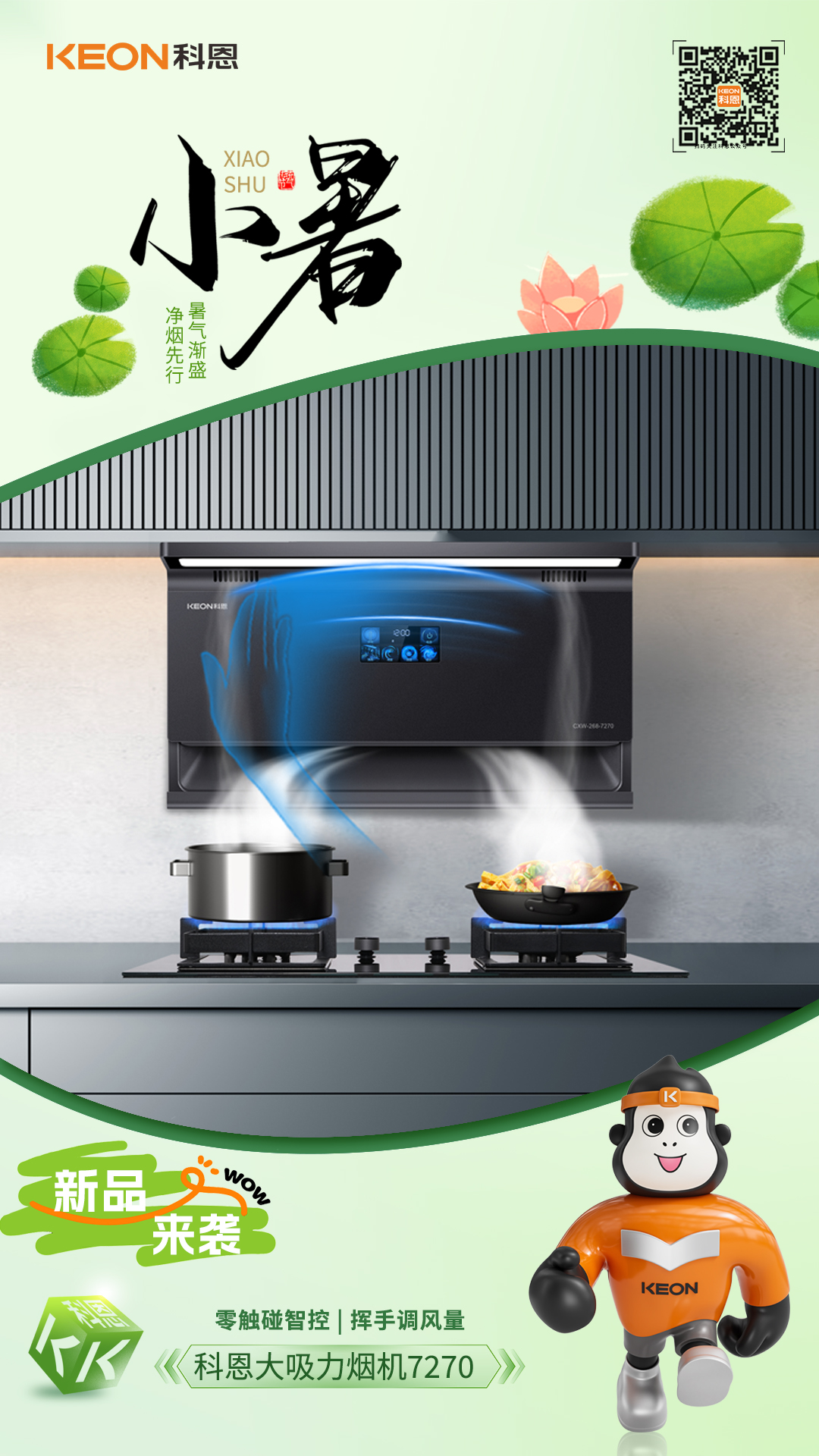凈煙守護,暑夏清涼。從凈煙到清潔,從性能到顏值,科恩7270煙機用硬核實力重塑烹飪體驗。讓爆炒的煙火氣,化作生活的詩情畫意,讓每一次下廚,都成為清涼愜意的慢時光!