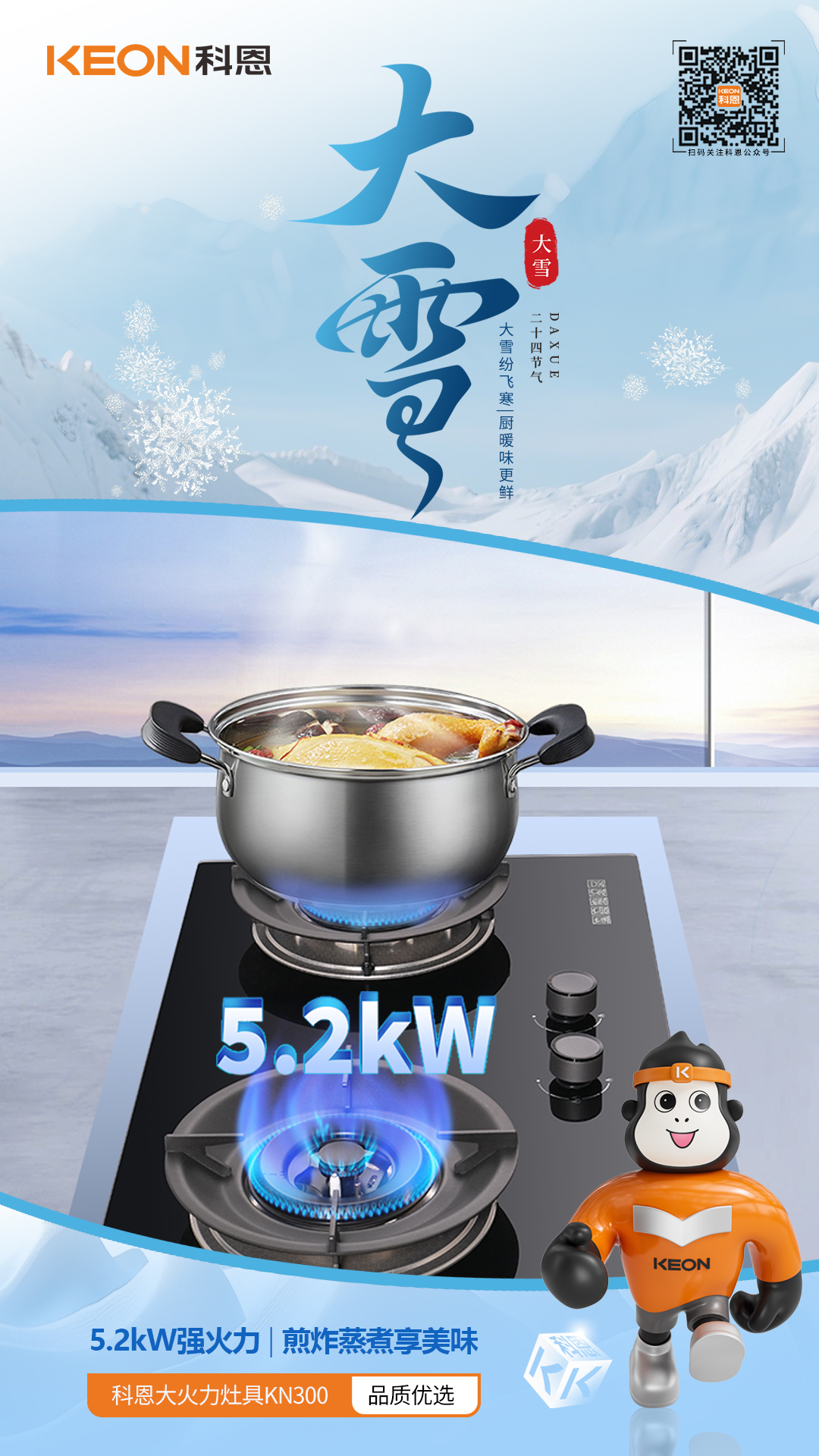 大雪煥新,暖意相伴。科恩KN300滿配實(shí)力,小灶大能,烹鮮首選,煎炒烹炸樣樣精通,健康美味輕松拿捏。選擇KN300灶具,讓大雪廚房暖意融融!