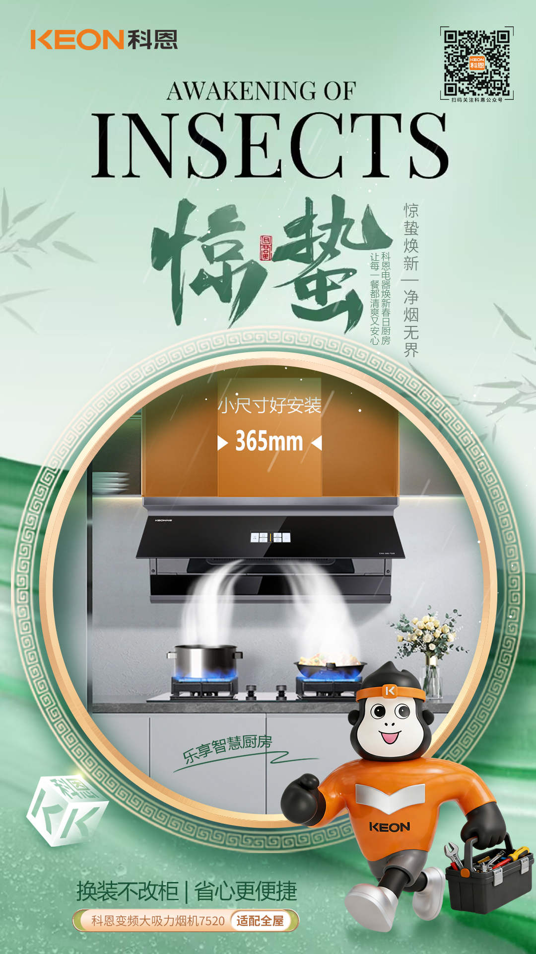 驚蟄啟灶,油煙匿跡。春雷乍響萬物蘇,廚房煥新正當(dāng)時(shí),舊機(jī)乏力煙彌漫,烹飪興致打折扣,科恩煙機(jī)7520登場(chǎng),以巧裝強(qiáng)吸破局,櫥柜零改煥新顏,油煙速凈享清新。巧裝適配,省心煥新。驚蟄換廚不用愁,小圍設(shè)計(jì)解煩憂,365mm纖薄圍板,多柜適配無壓力,免拆櫥柜直接裝,老房煥新省工時(shí),無需大動(dòng)干戈改,新機(jī)即刻入廚房。颶風(fēng)強(qiáng)吸,煙消無形。春雷伴炒煙火起,強(qiáng)吸速排不等待,28m³/min颶風(fēng)吸力,爆炒油煙瞬間凈,1060Pa高風(fēng)壓值,煙道擁堵輕松破,烹飪高峰排煙暢,廚房空氣常清新。